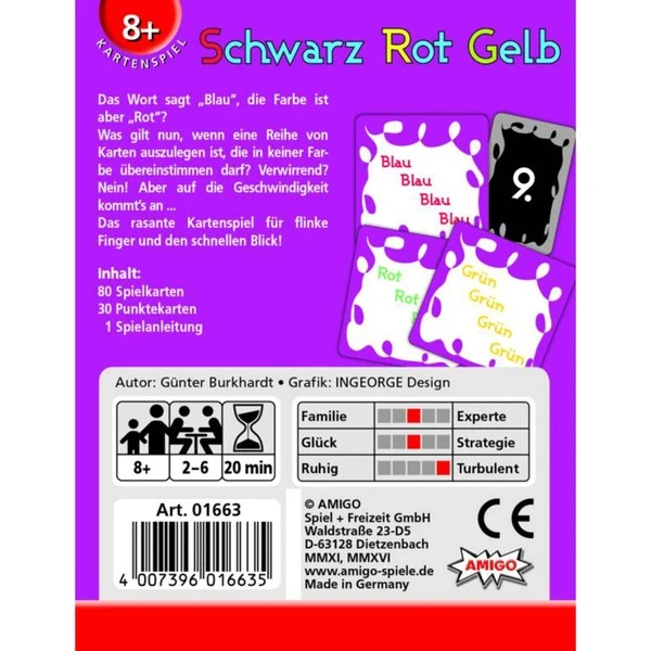 Ist grün nun rot oder blau? Oder doch gelb? Solche Fragen muss man sich immer wieder stellen, wenn man eine Partie Schwarz Rot Gelb spielt. Denn bei diesem Kartenspiel geht es darum, schnell und gezielt eine Reihe von Karten auszulegen, bei der die Nachbarkarten in Farbe, Farbwort und Anzahl der Wörter nie übereinstimmen dürfen. Doch das ist leichter gesagt, als getan, denn manchmal sagt die Karten-Farbe Rot, das Wort auf der Karte dagegen Gelb! Da sind ein gutes Auge und Schnelligkeit gefragt, wenn man am Ende mit der längsten Kartenreihe siegen will.Art.-Nr.: 1352881