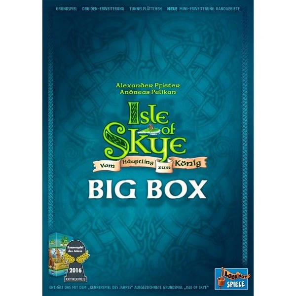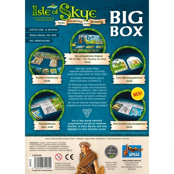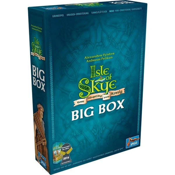 Die friedliche Landschaft in Isle of Skye täuscht, denn auf den weichen Sandstränden, zwischen sanften Hügeln und imposanten Gebirgsketten kämpften vor Jahrhunderten fünf Clans um die Vorherrschaft auf der Insel. In diesem Strategiespiel verkörpern 2-5 Spieler je einen Clan-Anführer. Sie erschaffen ein eigenes kleines Reich, um damit die nötigen Siegpunkte zu erreichen. Doch in jeder Partie sind nur vier der insgesamt 24 Wertungskarten enthalten, so dass immer eine andere Strategie erforderlich ist. Die Big Box enthält das Basisspiel und die Erweiterung Druiden, zusätzliche Wertungs- und Tunnelplättchen und die Mini-Erweiterung Randgebiete.Art.-Nr.: 1902311