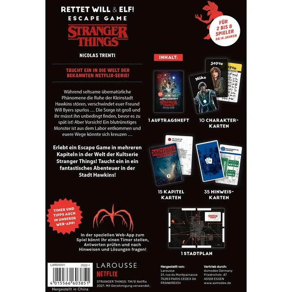 Stranger Things: Rettet Will & Elf! ist ein Escape-Game, das im Universum der Netflix-Serie Stranger Things angesiedelt ist. In 15 Kapiteln muss Will vor dem Demogorgon gerettet werden. Nur wenn alle Rätsel und Aufgaben innerhalb von 60 Minuten gelöst werden, kann Will befreit werden. Eine optional nutzbare Web-App mit Timer und Tipps lässt das Abenteuer noch lebendiger werden. Art.-Nr.: 1864081