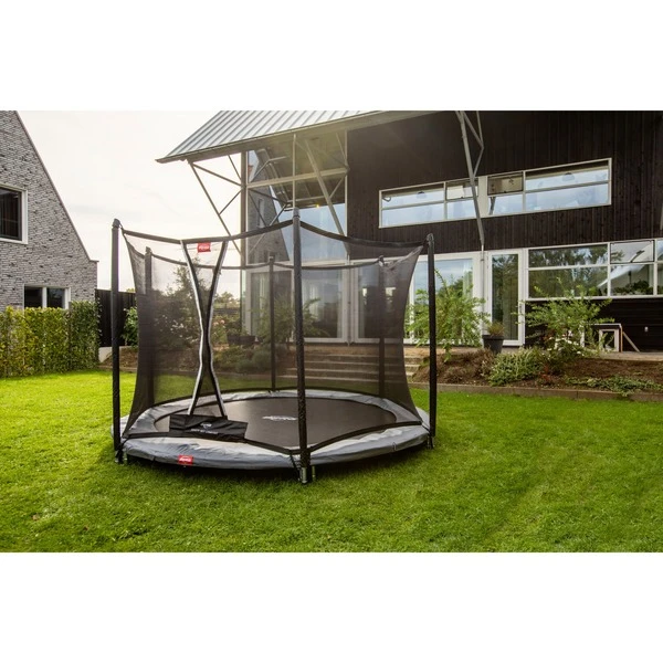 Die Trampoline der Serie Favorit bieten Sprungspaß über Jahre, geringen Verschleiß und sind nahezu wartungsfrei. Besonderen Sprungkomfort ermöglichen dabei die GoldSpring-Solo-Federn. Der Schutzrand ist oben und unten mit dickem PVC beschichtet – das gewährleistet eine lange Lebensdauer. Dieses runde Trampolin lässt sich mit einem Durchmesser von 200 Zentimetern auch in kleinen Gärten unterbringen. Als Inground-Trampolin kann es harmonisch in die Oberfläche integriert werden und bietet durch seine geringe Höhe besseren Unfallschutz. Das maximale Benutzergewicht liegt bei 50 Kilogramm. Es kommt mit dem Sicherheitsnetz Comfort, das mit dicker Pfostenpolsterung und einem selbstschließenden Eingang ein zusätzliches Plus an Sicherheit bringt.Art.-Nr.: 1625398