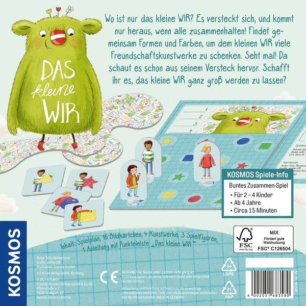 Wo hat sich das kleine Wir denn jetzt wieder versteckt? Es verkriecht sich immer, wenn sich Menschen streiten. Um es zu finden, knobeln zwei bis vier Kinder ab vier Jahren und lösen gemeinsam Aufgaben. Sie lassen das kleine Wir wachsen, indem sie bestimmte Formen und Farben finden und ihre Spielfiguren entsprechend auf dem Spielplan positionieren. Dann ist Geschicklichkeit gefragt: Gelingt es, die bunten Pappteile auf allen drei Figuren zu balancieren? Ganz nach dem Spielmotto „Ein buntes Zusammen-Spiel“ ist hier Kooperation gefragt: Nur wenn die Kinder gut zusammenarbeiten traut sich das kleine Wir Stück für Stück hervor. Und wer weiß: Vielleicht entsteht dabei auch eine neue Freundschaft? Passend zur bekannten Kinderbuch-Reihe begeistert dieses kooperative Kinderspiel mit niedlichen Illustrationen.Art.-Nr.: 100022267