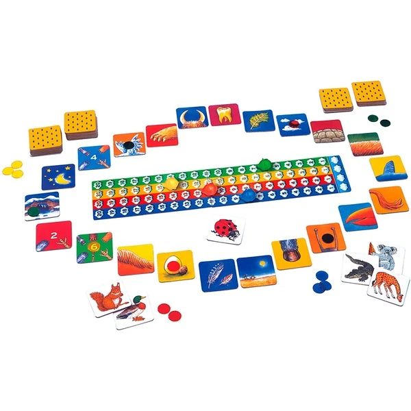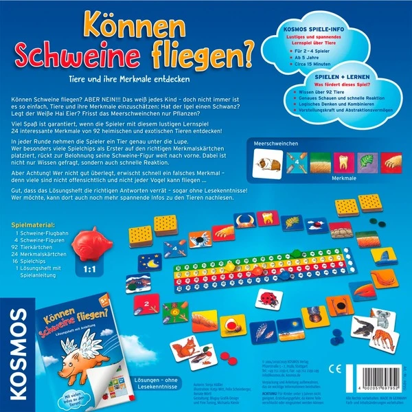 | Inhalt/Ausstattung | 92 Tier-Kärtchen, 24 Merkmals-Kärtchen, 4 Schweine-Figuren, 1 Schweine-Flugbahn, 16 Spielchips, 1 Lösungsheft mit Spielanleitung | ||