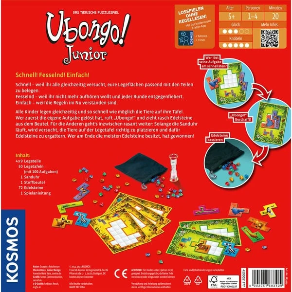Schnell – einfach – Ubongo! Das Bestsellerspiel – jetzt auch als tierischer Spielspaß für die Jüngsten! Alle Spieler legen gleichzeitig und so schnell wie möglich die Tiere auf ihre Tafel. Der Schnellste ruft „Ubongo!“ und zieht rasch Edelsteine aus dem Beutel. Für die Mitspieler geht es inzwischen rasant weiter: Solange die Sanduhr läuft, versuchen auch sie, ihre Tiere auf der Legetafel richtig zu platzieren und dafür Edelsteine zu ergattern. Wer am Ende die meisten Edelsteine besitzt, hat gewonnen. Zwei Schwierigkeitsstufen sorgen dafür, dass es immer spannend bleibt.Art.-Nr.: 1904877
