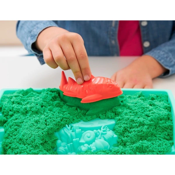 Mit Kinetic Sand eröffnet sich eine kreative und fantasievolle Sandspielwelt für drinnen: Dieser Spielsand ist formbar und faszinierend, gleitet durch die Hände und trocknet niemals aus, so dass er jederzeit spielbereit ist. Da Kinetic Sand an sich selbst haftet, bleiben die Hände sauber und auch das Aufräumen ist schnell erledigt. In diesem Set sind insgesamt 454 Gramm Sand in der Farbe grün enthalten. Hinzu kommen eine Sandbox mit verschiedenen Ebenen und drei Förmchen: Mit Hai, Schildkröte, einem kleinen Schloss und der Muschelschaufel lassen sich niedliche kleine Unterwasserwelten gestalten. Art.-Nr.: 100007973